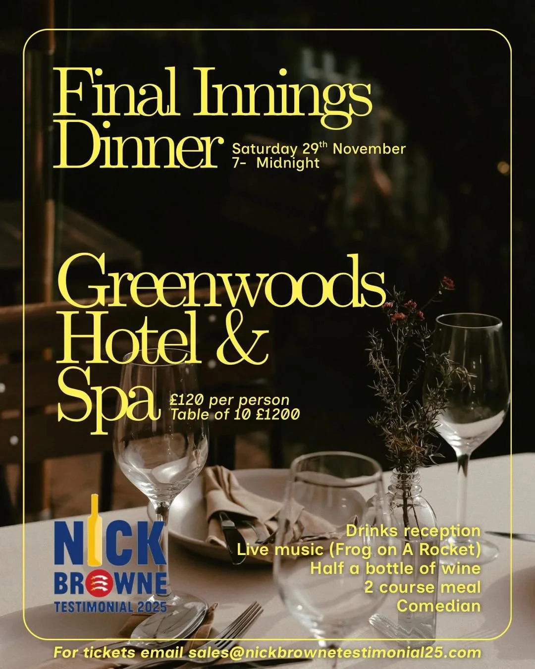 In celebration of a phenomenal Testimonial Year and to toast Nicks fantastic professional career we invite you to join us for an evening of comedy and live music